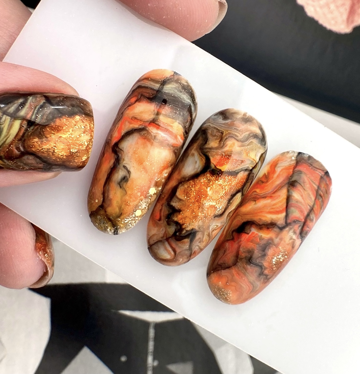 Демонстрация техники, набора красок на кисть и перенос на ноготь без "лужи". Отработка дизайна "камень в разрезе".
